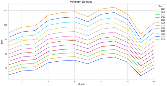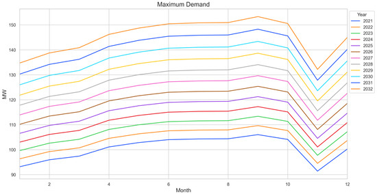 Figure 8 presents the growth of demand considering a high-projection tourist area, while Figure 9 presents the growth of demand considering low demand growth in tourist areas. Both scenarios consider projections from other tourist sectors in the Dominican Republic. In both figures, a decrease in demand can be observed when the winter season begins. In addition, the cement plant executes its maintenance plan at the end of the year, reducing its electrical demand.