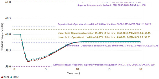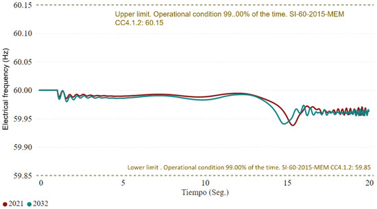 It is worth mentioning that the results obtained are shown to be outside the acceptable frequency ranges in the system operating conditions scenario, and that in the event of transients or faults that affect frequency stability, the primary regulation must come into play within 30 s of the event occurring, without leaving the established limits; this condition was fulfilled in the established analysis. These operating conditions show that even if a significant generator trips, the frequency can fluctuate and recover according to established regulations.