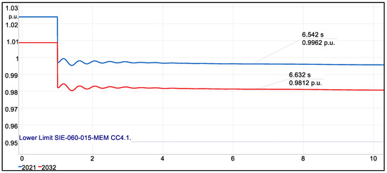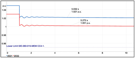 Figure 13 shows a behavior similar to that in the bus bar. In both 2021 and 2032, it is observed that both voltages are identified above the allowed limits before the event. When the input event occurs, the voltage in 2021 remains outside the range. In 2032, this behavior does not take place, implying that the introduced load is crucial in maintaining the voltage within the range established by the norm. In both cases, the same thing happens as in the previous point—oscillations occur that are later corrected, with the one in 2021 being more pronounced.