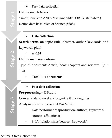 To develop the bibliometric analysis, we used the Bibliometrix package (which offers resources to analyse and map bibliometric information) that works under the R-Program software (version 3.2.3). For SNA, we used VOSviewer (version 1.6.15) [49]. This method can reveal how scientific research in smart tourism and sustainability has contributed to theoretical discussions, methodological advancements, and practical implications in this field.