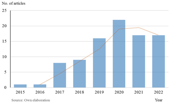 Figure 2 depicts the growth of scientific research on sustainability and smart tourism in cumulative terms from 2015 to 2022. It has been growing exponentially, especially from 2018 to 2020, but slightly decreased from 2020 to 2022. In fact, smart tourism has become a buzz term not only in academics but also in the media and the business world. In 2019, the European Union promoted a new initiative to find the “European Capital of Smart Tourism”, recognizing exemplary European cities on practices of smart tourism.