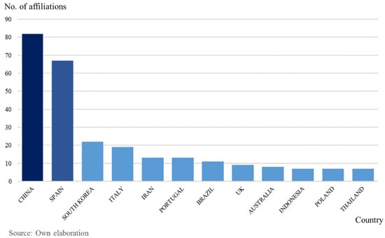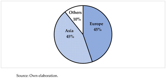 Crossing information from both figures, we note that the scientific literature is predominantly from Europe, where the Mediterranean region, including Spain, Italy, and Portugal, contributes the most, and Eastern Asia, strengthen by the production of China, mainly, and the Republic of Korea. Oceania, Africa, and the Americas are incorporated in “Others” (Figure 3), as they have individually a less significant proportion of article production. In this analysis, two clusters are identified: a group of Asian countries characterized by technologically integrated cities that relate to the smart concept and Southern Europe, which is highly dependent on tourism and not necessarily reputable for technological interconnectivity in its cities.