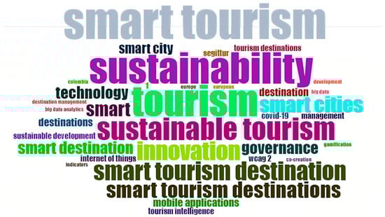 Next, the most frequent keywords (≥6 times) used by the authors of the collected scientific documents are listed in Table 4. This ranking is also observed through a word cloud (see Figure 5) that depicts the top 35 keywords, in which the size of each word reflects its frequency. Due to the high frequency of the term “smart tourism” (20%) among the 35 most used keywords, its relative size was reduced to make room for other keywords and to ensure a clear and comprehensive conceptual analysis of the word cloud. As expected, keywords such as “smart tourism” and “sustainability” dominate, which supports our selection of keywords in WoS. Nonetheless, it is interesting to note that the term “smart tourism” is much more frequent than “sustainability”, reinforced by terms associated with smartness (“smart cities”, “smart tourism destinations”, “smart destinations”, and “smart”). Additionally, it is possible to understand that keywords related to R&D and information and communications technology (ICT), such as “innovation”, “technology”, “smart”, and “tourism intelligence”, have a significant weight across the approached topics. Words related to management and politics, such as “governance”, “co-creation”, and “destination management”, are relevant and reflect the political aspect involved in the construction of a smarter and more sustainable kind of tourism.