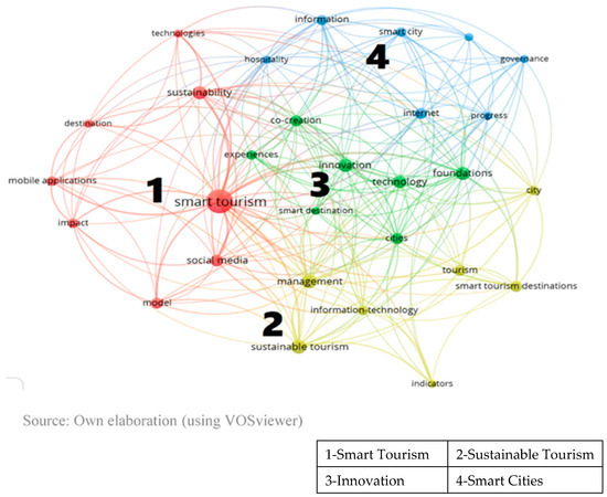 Based on an initial set of 591 keywords (author keywords and keywords plus), the following criteria were applied to achieve the keyword co-occurrence network: (1) the full counting method, where each of the links has strength of one; (2) a minimum number of co-occurrences of six, meaning that each keyword belonged to at least six documents; and (3) association as the normalization method of the network layout [49]. The resulting network (Figure 6) was composed of 29 keywords and organized into four clusters identified by the VOSviewer algorithm, each named according to its main node: (1) smart tourism, (2) sustainable tourism, (3) innovation, and (4) smart cities (see Figure 6 and Table 6). Interestingly, certain themes such as technology and smart tourism destination were found to belong to different clusters (Table 6), specifically, smart tourism, sustainable tourism, and innovation clusters. This finding is consistent with previous analyses (e.g., Table 4), which identified smart tourism as the most frequently occurring term in our database.