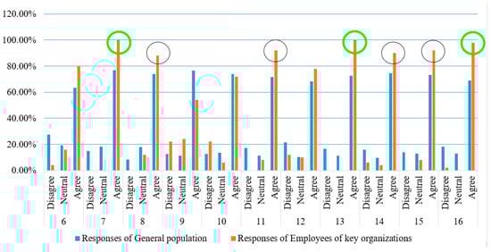 The results shown in Figure 3 are related to the responses given by the general population and the employees of key organizations. It is seen that there is a similarity in responses given by these groups. This result indicates that the general population understands the concept of flooding and what must be done in order to control or mitigate flooding in the area. This result also indicates that further education is not necessary on the concept of flooding, as the people already understand the concept. However, there is a general belief that the employees of these key organizations have a more detailed understanding of the concept of flooding, hence, their responses should be key in determining the factors or points to consider best for mitigating or controlling the impact of flooding in the area. From the results above, it is found that the following points have the highest percentage of people in agreement.