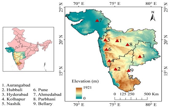 The present study was carried out over nine developing cities in India (Figure 1). The population of each city is greater than 0.4 million []. These cities mainly span the four states of India, i.e., Maharashtra, Karnataka, Gujarat, and Andhra Pradesh. The physical and land surface characteristics of selected cities are different from each other. At the same time, the local climatic conditions of the cities are also different due to the variation in their topography and geographical location. These cities mainly fall under three climatic zones, i.e., hot and dry, hot and humid, and composite climate []. Due to the strong demand in the residential and industrial sectors, major cities, such as Hyderabad, Ahmadabad, Pune, Nashik, and Aurangabad, are seeing rapid urban development growth.