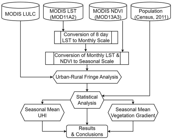 LST (8 days) and NDVI (monthly) data were obtained from 2006 to 2016 from MOD11A2 and MOD13A3, respectively. The temporal resolution of both datasets were not equal. Thus, the eight days of LST data were converted to the monthly mean datasets. In the further part, the monthly mean LST and NDVI datasets were converted to the seasonal mean datasets for the pre-monsoon (March to May) and winter (November to February) seasons. The quality of the MODIS datasets during the monsoon (June to September) season was not up to the mark due to the cloud cover; hence, we have not integrated the monsoon season for our analysis. Afterward, all the seasonal data were calculated over the nine developing cities of India for the 11 years, averaged out, and mean Climatological data were prepared for the pre-monsoon and winter. During the entire data pre-processing and preparation procedure, null values in the datasets were excluded. Figure 2 represents a general flow of data processing and methodology flow.