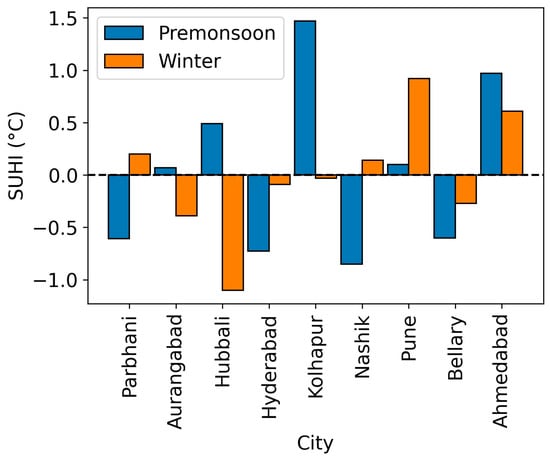 In the winter, the maximum intensity of the SUHI is found over Pune City (0.95 °C), followed by Ahmadabad (0.61 °C). Some cities, such as Aurangabad, Hubbali, Kolhapur, Hyderabad, and Bellary, show the negative behavior of the SUHI, i.e., the SUCI, during the winter season.