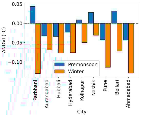 Figure 4 depicts that in the winter season, in cities experiencing the phenomenon of the SUCI, a negligible difference (−0.003 to −0.009) has been observed in ∆NDVI. On the other hand, cities with a higher magnitude of ∆NDVI represent the typical intensified profile of the UHI during the winter season. These seasonal alterations in the SUHI intensity may have occurred due to the seasonal changes in NDVI.