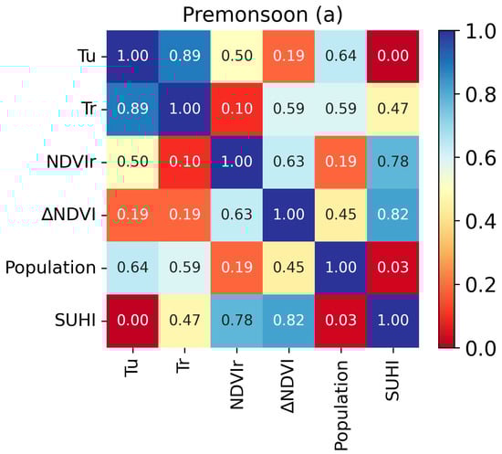 Thus, during this study, the LST of the urban and rural areas has been taken as a proxy variable to the land surface characteristics of the urban and rural areas, such as albedo, emissivity, heat capacity, etc. Various studies have been conducted, such as [,], to explain the negative relationship between temperature and vegetation. The vegetation in a particular territory keeps that area cool through evapotranspiration. Hence, the total amount of vegetation present in the urban and rural areas controls the temperatures of the respective area. It is considered one of the significant parameters that can pedal the magnitude of the SUHI. In addition, the disparity of vegetation strength between urban and rural areas can alter the natural cooling process of the environment, resulting in changes in the temperature difference between urban and surrounding rural areas. Besides these climatic and biophysical parameters, the population of the urban area is a significant factor that plays an essential role in the formation of SUHI. The more population in the urban area represents the high density of buildings, vehicles, roads, low sky view factor, and many industries. It creates more anthropogenic heat that gets discharged and trapped in the urban environment, making the urban area warmer. Hence, the population is also essential for modeling the SUHI effect. Figure 5 represents the correlation coefficient, i.e., R, between SUHI, and other predictors for the pre-monsoon and winter seasons.