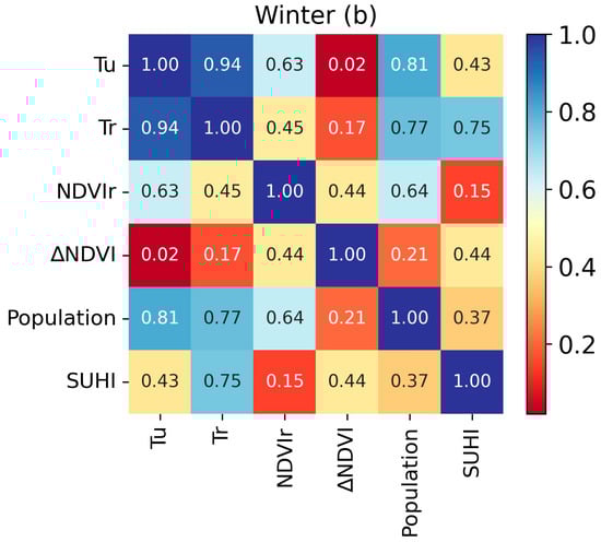 During the winter, vegetation coverage in the surrounding rural area is a decisive factor controlling the magnitude of the SUHI. Initially, NDVIr as an alone predictor coefficient of determination (R2) was 0.62. Thus, to perk up the model performance, additional predictors were added.