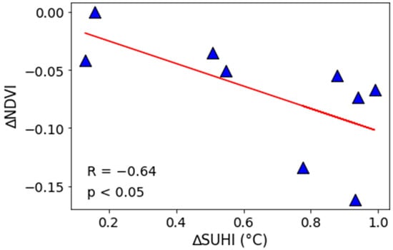 Association between seasonal alterations in ∆NDVI and ∆SUHI over 9 Different Cities in India.