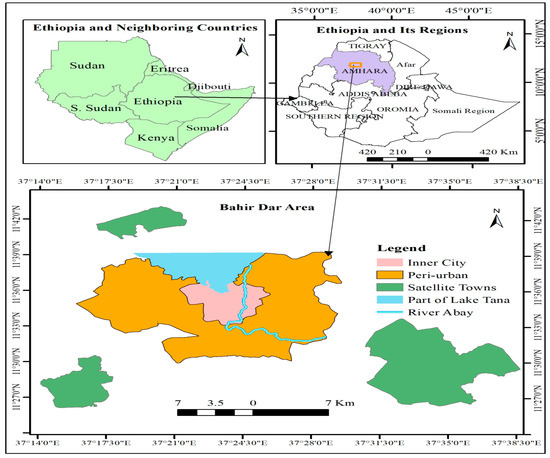 Ethiopia is situated in the Horn of Africa, sharing borders with Eritrea, Djibouti, Somalia, Kenya, South Sudan, and Sudan. The country is composed of eleven regional states and two chartered cities, namely Addis Ababa and Dire Dawa. The research site, Bahir Dar, is the capital city of the Amhara Regional state, located in the northwestern part of Ethiopia, with an area coverage of approximately 76.5 square kilometers (km2). Bahir Dar’s absolute location is within the tropics of the Northern Hemisphere, situated at 11°27′ N to 11°43′ north latitudes and 37°14′ E to 37°38′ east longitudes [22]. As it is shown in the map of the study area (Figure 1), the city comprises the central city of Bahir Dar, peri-urban and rural administrative kebeles, which are the smallest administrative region in Ethiopia, and three satellite towns, namely Zegie Town in the North, Meshenti Town in the Southwest, and Tis Abay Town in the Southeast. The central city includes six sub-cities, namely Atse Tewodros, Gishe Abaye, Belay Zelke, Dagmawi Menelik, Tana, and Fasilo, and six peri-urban rural administrative kebeles, namely Zenzelma (Northeast), Woreb Kol (East), Sebatamit (Southeast), Addis Alem (South), Yibab (Southwest), and Woramit (Northwest). Bahir Dar is approximately 563 km Northwest of the capital city, Addis Ababa, along the Addis Ababa–Debre Markos–Gondar Road.