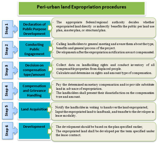 According to [15], The urban centers of Ethiopia are experiencing an unprecedented demand for urban land and housing due to their rapid growth. As a result of this, peri-urban regions have become vital sources of land for the expanding urban areas, and the conversion of rural land into urban land use has occurred at an unprecedented pace [16,17]. To accommodate the land demand of such a quickly growing urban population, there is the mass conversion of peri-urban land from rural to urban use through the expropriation tool of the government [18,19,20]. In the country, farmland is the primary source of agricultural production and farmers’ livelihoods and serves as a socio-economic security measure for them [15]. In addition, unrestricted urban growth compels urban governments to search for more land, often from adjacent rural areas [5,15,21,22,23]. The Federal Democratic Republic Ethiopia (FDRE) Constitution explicitly states that compensation must be paid in advance to any person who lost property due to an expropriation order. A legal process for expropriation, from declaring public interest to paying compensation, is also described in Proclamation No.1161/2019.