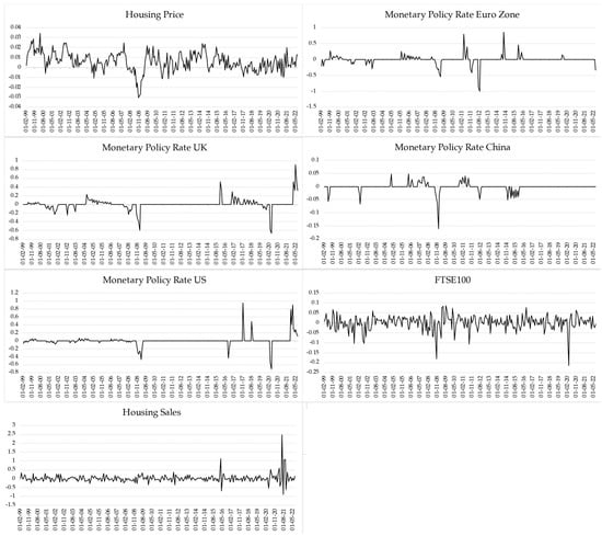 Some widely validated financial variables have been selected to conduct this exploration, considering two agents: central banks and the international stock market. On the one hand, it is understood that central banks enact monetary policy to influence the internal economic balances of each nation. In this case, the monetary policy rate of the central Bank of England has been used as an explanatory variable. Considering that the United Kingdom in general and London in particular have a great openness to international trade, the monetary policy rate of the eurozone, China and the United States of America was incorporated into the analysis. Thus, in addition to looking exclusively at the influence of territorially based economic decisions in the UK, this analysis also assesses the potential impact of the monetary policies of some of the UK’s main economic partners. In addition, a purely financial factor has been incorporated, which is the daily valuation in monthly averages of the FTSE 100 Index, which is composed of the financial valuation of the main UK companies on the international stock exchange. The data series is taken with its original values, which are then transformed to work with the variations between periods, to facilitate the comparison of the dynamics between the variables used. The descriptive statistics of the variables used can be seen in Table 1. The data series were first-difference transformed to unify the sample work and achieve a unit root test suitable for time series modelling. In this sense, we work with the first difference of average house prices in London, excluding the City of London for the reasons explained above. The descriptive summary of the transformation of the data series is shown in Figure 1.