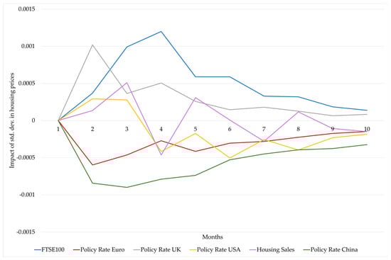 Finally, Figure 2 gives relevance to these findings by comparing the impact curves generated by a shock of one standard deviation in the magnitude of these variables on house prices in London. The figure shows positive reactions, which push house prices up, and negative reactions, which push house prices down. Within the magnitudes of comparative impact, the effect of an FTSE 100 shock has the largest impact on house prices, peaking in the fourth month after the shock. This finding suggests that house prices would be sensitive to the performance of the London Stock Exchange, so there would be an influential relationship between an elementary financial factor such as the FTSE 100 and house prices. A shock to the UK monetary policy rate also generates an impact, which is much more immediate as peaks in the second month, but, as can be seen in Figure 2, the aggregate impact over 10 months is smaller than that of a shock to the FTSE 100. On the other hand, a dual outcome, i.e., pushing up and then pushing down house prices, is observed in shocks induced by US monetary policy and London house sales. In the case of house sales, the effect is alternating, which could be interpreted as indicating that the supply–demand elasticity of house prices tends to seek equilibria. The impact of US monetary policy is interesting, given that it generates an initial positive impact that then tends to level off over time. In other words, a shock in US monetary policy first pushes up house prices and then pushes them down. Shocks in Chinese monetary policy and the eurozone produce reductions in house prices, opening the door to a discussion on the elasticity of house prices in London based on its relationship with its trading partners in terms of imports, given that the eurozone accounts for 56% of imports into the UK, followed in second place by China, which accounts for 12% of imports. This effect based on the relationship with trading partners could be linked to the cost of building materials, but this would require further research.
