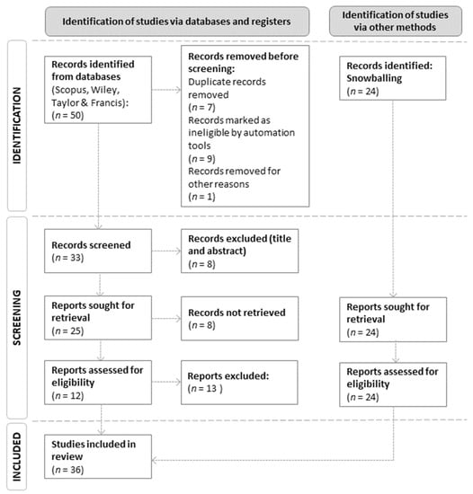The initial database search identified 50 studies, which were further filtered to include only original research articles written in English and published between 2011 and 2021. This date range was selected because a previous general literature search on urban vacant land revealed that revitalisation efforts had gained traction during these years. After further screening, 12 studies from the database search and 24 studies obtained via other methods were selected for this review.