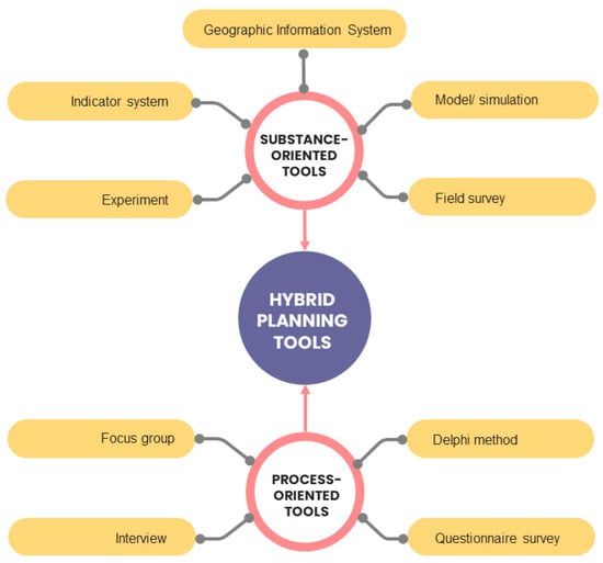 This review encompasses 36 studies discussing vacant land revitalisation planning tools. These studies covered planning tools that can be further classified as substance- and process-oriented tools (Figure 2). Substance-oriented planning tools are indicator systems, field surveys, GIS, models/simulations, and experiments. Majority of the studies utilised GIS (n = 19), followed by models/simulations (n = 13), indicator systems (n = 11), field surveys (n = 9), and experiments (n =3). Process-oriented planning tools include experts and community involvement using focus groups, the Delphi method, interviews, and questionnaire surveys. Two studies employed process-oriented tools with the community and expert involvement, and five used hybrid planning tools, combining the substance- and process-oriented tools.