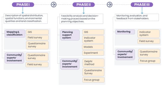 Goal setting for the revitalisation effort takes centre stage in Phase 2 of the planning process. Indicator systems, GIS, models/simulations, and experiments are all examples of decision-support systems and analytical planning tools that can be used to envision potential futures for redeveloping vacant land. Through its many spatial analysis tools, GIS is a powerful resource for identifying the areas with the greatest potential for urban greening. McClintock et al. [34] utilised remotely sensed data to map areas with potential for urban agriculture. Using hotspot analysis in GIS, Smith et al. [51] mapped potential greening areas by focusing on privately owned land lacking buildings and impervious surfaces. In addition, the spatial analysis tools available in GIS can be used to assess the potential to revive vacant land. Based on the generated suitability map, vacant land reclamation strategies may be suggested, along with functions and activities that improve the city’s ecological or social health. With a focus on privately owned land that is devoid of buildings and impervious surfaces, Pearsall [36] discovered the potential of green conversions of vacant parcels to reduce urban heating inequities. This was accomplished by examining socio-spatial patterns using land surface temperature (LST) and the normalised difference vegetation index (NDVI). The Python script in GIS was developed and implemented by Newman et al. [38] to prioritise vacant lands requiring immediate intervention, particularly in cities that are shrinking and experiencing land inactivity. The tool could support a smart decline policy that prioritises citizens’ health and well-being by improving the quality and accessibility of green spaces. Furthermore, it is crucial to take into account how long urban land has been vacant, as this will likely have a more significant impact on a city than the overall number of vacant properties [38].