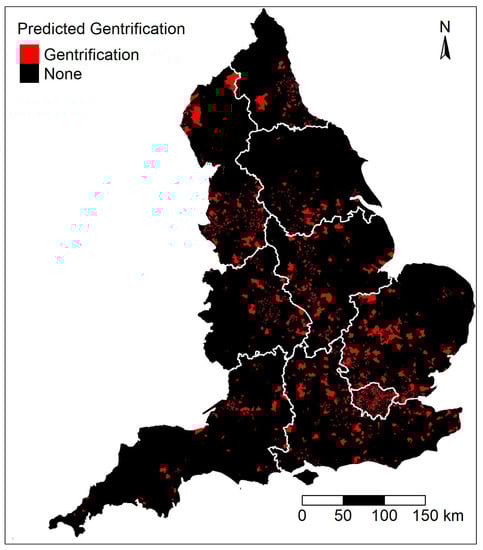 Residential gentrification (Figure 3a) was the most extensively predicted type of gentrification in England during the 2010–2019 study period and was predicted around major urban conurbations, including the outskirts of Greater London, Manchester, Newcastle, Birmingham, Nottingham, and Leeds. This supports previous research on gentrification within these cities: for example, gentrification in Newcastle was connected to development-driven (new-build) gentrification, a facet of residential gentrification [40]. State-led-replacement development-driven gentrification has also been experienced in Salford, Manchester, with negative impacts on those displaced [41].
