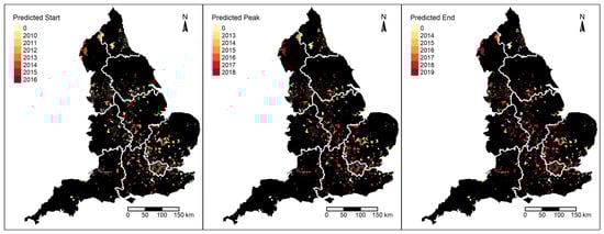 The final models were run as regressions via XGBoost to predict the start, peak, and end years of the predicted gentrification cycles. These predictive models were applied to the LSOAs predicted with a gentrification type only (4526 LSOAs), opposed to the entire of England. Figure 4 shows the temporal predictions relating to the periodicity of gentrification: the start, peak, and end of gentrification in England. The gentrification start years were mostly predicted to be 2010 and 2011, but there were clusters with sequential starting years, mostly in the southern half of the country. The predicted peak years of gentrification indicate that clusters of LSOAs experiencing gentrification, regardless of their starting years, peaked at similar times, particularly in the south. Such clustering is also observed within the gentrification end years. This suggests that neighbouring localities of gentrification had varying velocities such that they peaked and completed their cycles at similar times. However, it does also show that although the model was applied to only those LSOAs that were predicted to gentrify, 141 LSOAs were consistently predicted without any temporal properties, suggesting no cycle of gentrification. However, the predicted zeros reflect areas where no temporal properties of the predicted gentrification were predicted.