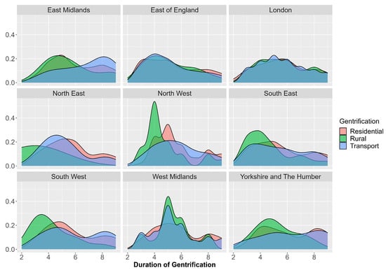The number of years taken to reach the peak of the process and the overall duration of the predicted gentrification in England were then calculated instead of being directly predicted. Table 5 shows the national averages of the duration, the number of years from the start to the peak, and the number of years from the peak to the end. Residential gentrification typically has a slower accumulation of change, taking longer to reach its peak before ending relatively swiftly, with the largest overall duration. On average, transport gentrification has similar manifestations to residential gentrification, with a more gradual accumulation of change, an accelerated peak to end, and a similar overall duration. Rural gentrification, however, has a more rapid accumulation of change, with a shorter start to peak duration before a relatively more gradual completion and a shorter average duration.