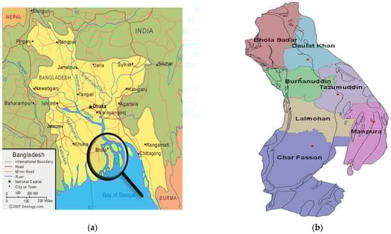 - BBS. Bangladesh Bureau of Statistics. Statistics and Informatics Division (SID), District Statistics of Bhola: Preliminary Results, Ministry of Planning; Government People’s Republic of Bangladesh: Dhaka, Bangladesh, 2011. [Google Scholar]