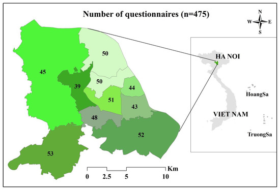 Study area and number of questionnaires. Note: Different green color represents the number of questionnaires collected in each district (total n = 475).