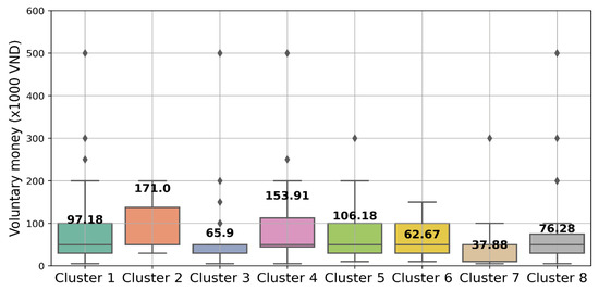 Average voluntary money of each cluster. On each boxplot, the central mark indicates the median, and the bottom and the top edges of the box indicate the 25th and 75th percentiles, respectively. The diamond symbol represents the outliers.