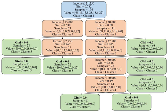 To train the DT model, 50% of the dataset is used. The model with a maximum depth of 5 is chosen as it provides sufficient complexity to classify all the groups in the dataset. This means that the DT, with its five levels of splits, can effectively capture the underlying patterns and relationships necessary to classify the samples into their respective groups. Importantly, after these five levels of splits, it is worth noting that all eight groups in the training dataset are successfully classified with a Gini index of 0. This signifies that the decision tree model has accurately captured the distinct characteristics and patterns of each group, resulting in pure nodes at the end of the fifth level. Achieving a Gini index of 0 for all eight groups indicates the absence of impurity or the mixing of samples from different groups within their respective nodes (see Figure 6). This showcases the model’s effectiveness in accurately separating and classifying the samples. By achieving a Gini index of 0 for all eight groups after five levels of splits, the decision tree classification model of Module II demonstrates its strong predictive power and ability to correctly assign new samples to their appropriate groups based on their input features.