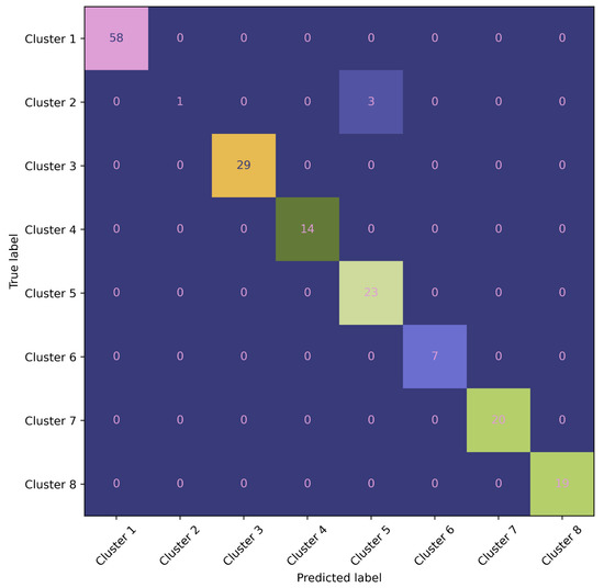 Confusion matrix analysis of a decision tree model (Module II) for eight-cluster prediction.