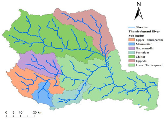 The river basin Thamiravaruni was chosen in this study as the focus catchment. The basin is one of Tamil Nadu’s oldest systems. The river in the south of this state is short but perennial. Irrigation development for the people living near the Thamiravaruni River is a major source of revenue. The behavior of the river is erratic, and the major part of the region under the basin is susceptible to droughts of mild to severe intensity. The river Thamiravaruni originates at an altitude of 2000 m and converges with Bengal Bay at the Gulf of Mannar from the Pothigai Mountains of the eastern slopes of Western Ghats. From its origins up to the Gulf of Mannar, the river Thamiravaruni is 125 km long. For the Thirunelveli and Thoothkudi districts, it is their lifeline. The overall area of the basin is 5969 km2, 688 km2 of which is hilly. The basin is located between latitudes of 8°21′ N and 9°13′ N and 77°10′ E and 78°8′ E. Figure 1 shows the map of the basin of Thamiravaruni. Southwest and northeast monsoons benefit from the forecasting of rainfall over the Western Ghats.