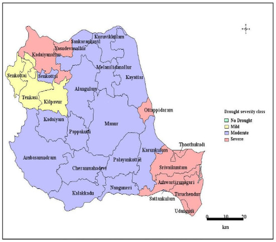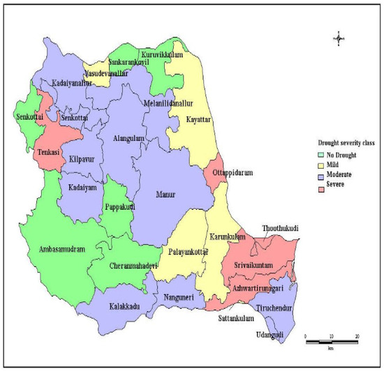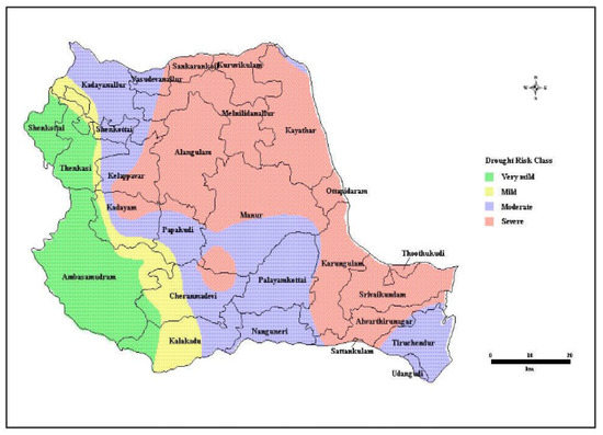 As Ambasamudram, Tenkasi, Gadana Dam, and Senkottai are shielded by the Western Ghats, they are less prone to meteorological drought risk than other stations. However, Tenkasi, Gadana Dam, and Senkottai are not located on the main stream and are located on the tributaries of the Thamiravaruni River. They are slightly more prone to drought compared to Ambasamudram. Palayankottai, Nanguneri, Tiruchendur, Udangudi, part of Kadaiyanallur, Vasudevanallur, Kelappavar, Kadaiyam, Pappakudi, Cheranmadevi, Kalakkadu, Azhwartirunagari and Kayattar blocks are under moderate drought risk status. Northern and tail-end blocks such as Sankarankovil, Kuruvikulam, Kayattar, Ottappidaram, Srivaikuntam, Karunkulam, Sattankulam, Manur, Azhwartirunagari, and Tiruchendur are all liable to severe drought risks as shown in Figure 4.