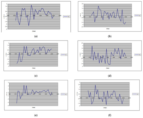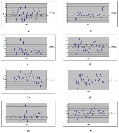 The SPI values for all the rain gauge stations were calculated based on monthly rainfall values. The SPI is calculated on the basis of long-term rainfall records for the desired station, which is then converted into a normal distribution so that the average SPI is nil. The ranks were allocated, and the membership value was based according to the drought classification. Figure 5 shows the evolution of SPI values for various rain gauge stations. Dry classification according to the SPI values was observed to differ from IMD values. Ambasamudram rain gauge station, for example, for the year 1974, was classified as moderate drought prone to IMD. However, SPI was also classified as ‘extremely dry’. The inoperative values of Karuppanadhi, Nilaparay, and Kadaiyanallur were not consistent and were not considered for SPI testing. Figure 5a–v gives a good indication of the drought history of the specific station to plot a time series of years against the SPI.