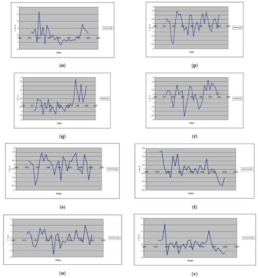 Evolution of SPI for an annual time scale for different locations in the Thamiravaruni River Basin. (a) Ambasamudram (b) Ayikudi (c) Cheranmadevi (d) Dam Camp (e) Gadana Dam (f) Kannadian Anicut (g) Kayattar (h) Kovilpatti (i) Manimuttar (j) Nanguneri (k) Ottappidaram (l) Palayankottai (m) Papanasam (n) Radhapuram (o) Sankarankovil (p) Sattankulam (q) Senkottai (r) Sivagiri (s) Srivaikuntam (t) Tenkasi (u) Tiruchendur (v) Thirunelveli.