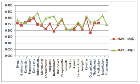 The performance of both MA and AR models was evaluated using the Root Mean Square Error (RMSE) for annual time lead. The performance of the fuzzy-based forecasting model using MA and AR processes is examined, and the results are presented in Figure 6. Based on the RMSE, the MA (2) process performs well in forecasting the fuzzified drought ranks compared to the AR (2) process. It is observed that the RMSE value for MA (2) was less compared to the AR (2) process. Hence, the MA (2) results were used for forecasting the drought severity class for the immediate time step.