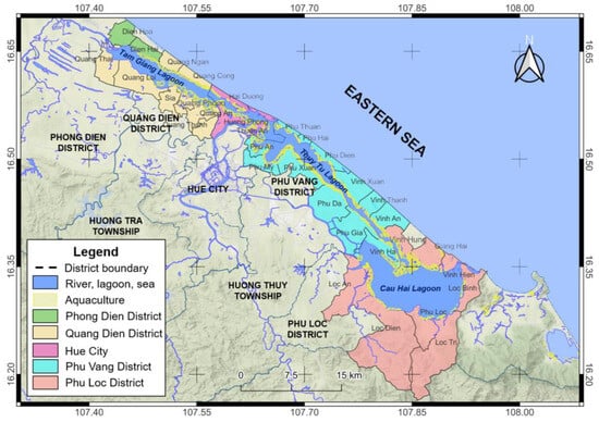 The Tam Giang–Cau Hai lagoon system stretches from 16°14′ to 16°42′ North latitude and 107°38′ to 107°93′ East longitude. The study was carried out in wards and communes surrounding the Tam Giang–Cau Hai lagoon system. A total of 21 survey wards and communes were included, located in four districts and a city: three wards/communes (Hai Duong and Huong Phong Communes and Thuan An Ward) in Hue City; two communes in Phong Dien District (Dien Hai and Dien Hoa); five communes in Phu Loc District (Giang Hai, Vinh Hien, Phu Gia, Loc An and Vinh Hung); six communes in Phu Vang District (Phu Xuan, Phu Da, Phu Hai, Phu Dien, Phu An and Phu My); and five communes in Quang Dien District (Quang Loi, Quang Thai, Quang Cong, Quang Ngan and Quang An) (Figure 1).