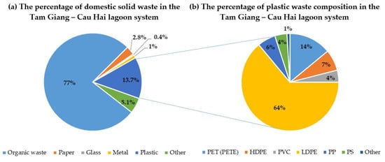 Plastic waste in the Tam Giang–Cau Hai lagoon system. (a) The percentage of domestic solid waste in the Tam Giang–Cau Hai lagoon system; the domestic solid waste comprises organic waste, paper, glass, metal, plastic and other. (b) The percentage of plastic waste composition in the Tam Giang–Cau Hai lagoon system including polyethylene terephthalate (PET/PETE), high–density polyethylene (HDPE), polyvinyl clorua (PVC), low-density polyethylene (LDPE), polypropylen (P), polystyren (PS) and other (glass fiber, polycarbonate, acrylic).