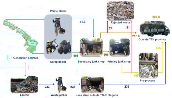 Through interviews and surveys, various types of solid waste such as plastic, paper and metal were classified and sourced from households, businesses and offices. These materials were then sold to intermediate traders, commonly known as scrap dealers. Waste pickers also collected recyclable materials from street garbage bins and garbage collection points. The upcoming process is that the materials collected by scrap dealers and waste pickers are purchased by secondary junk shops and transported to primary junk shops or recycling facilities outside Thua Thien Hue province. Furthermore, when solid waste is transported to landfills, waste pickers have the opportunity to recover “valuable” waste, which they can sell to recycling facilities outside Thua Thien Hue province. The recycling process of plastic waste in the Tam Giang–Cau Hai lagoon system is shown in Figure 4.