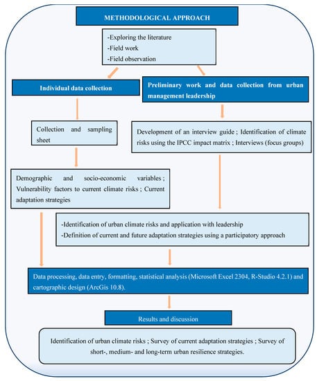 To carry out this study, we adopted a methodological approach based essentially on literature exploration, individual interviews with the population and focus groups with urban management leadership (Figure 3). The literature review provided us with a panoramic view of the methodologies of similar studies carried out in other countries. Firstly, preliminary investigations with leadership (district managers, municipal decision makers, civil society representatives, etc.) were carried out in each of the city’s ten (10) districts. This first stage enabled us to identify and validate the climate risks affecting urban areas. Most of these climate risks can be found in climate policy documents such as the NDC, the NAPA and various national communications from Chad. The work carried out with urban leadership during the focus groups enabled us to list the factors contributing to vulnerability to climate risks, based on the use of the IPCC’s Vulnerability, Impacts and Adaptation (VIA) study approach. This approach integrates the climate risk identification and prioritization matrix (through exposure and sensitivity indices), the impact matrix (which highlights the impacts of climate risks and the various urban exposure issues) and, finally, the dimensions of adaptive capacities. To assess the sensitivity of urban issues to climate risks, three decision-making indicators were taken into account: exposure index, impact index and rank. The exposure index (IE) is the sum of the impacts of climate risks on an urban issue. The impact index (II) is the sum of the impacts of a climate risk on urban issues. Rank is used to rank urban issues. The issue with the highest exposure index is the most sensitive to risk.
