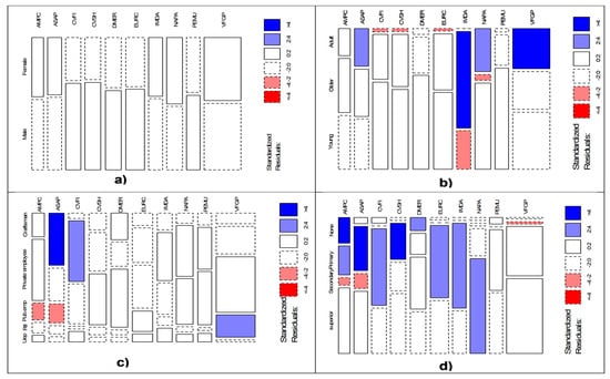 Figure 4 shows the cross-tabulation of social parameters and vulnerability factors. Analysis of this figure shows that the proportion of the vulnerability factor “VFGP” is higher than that of the other factors, whatever the social category to which it belongs. The values of the standardized residuals of the proportions of these cross-tabulations are between −2 and 2, i.e., very close to the numbers expected under the independence hypothesis, with the exception of adults (b) and retailers (b), who appear to be represented with residual values greater than or equal to 2.4 (blue VFGP boxes).