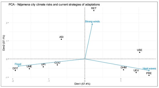 Projection in the first two main axes of the PCA of climate risks and the urban adaptation and resilience strategies used. RET: Refurbishing equipment after strong windstorms; ASI: intercommunity social assistance; USE: use of ecosystem services from trees (e.g., tree shade) on hot days; DHM: sleep outside the house (in the open air) on hot nights; UEV: energy use for ventilation of homes and offices against heat waves; PRE: regular intake of drinking water; DDT: temporary relocation of households after flooding; UME: use of motor-driven pumps to evacuate water after flooding; UPI: use of traditional pirogues during the floods; CDU: building of urban dikes.