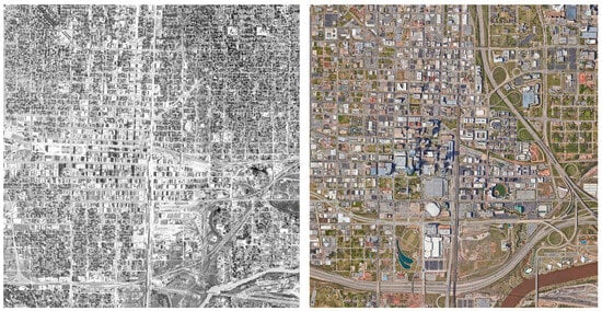 Aerial view of OKC in 1941 (left, before urban renewal) and 2022 (right). Photos: Department of Agriculture. Agricultural Stabilization and Conservation Service. Aerial Photography Field Office. Oklahoma County, Oklahoma, 1941. 2B-141, 1B-145. 1:20,000, original source. Oklahoma Historical Aerial Digitization Project, 2022, electronic source: https://www.oklahoma.gov/content/dam/ok/en/occ/documents/og/ohadp/oklahoma/sns_oklahoma_1941/2B-141.jpg, https://www.oklahoma.gov/content/dam/ok/en/occ/documents/og/ohadp/oklahoma/sns_oklahoma_1941/1B-145.jpg (accessed on 20 August 2023), images adapted by the authors. Google Maps, ©2022 Airbus, CNES/Airbus, Maxar Technologies, U.S. Geological Survey, USDA/FPAC/GEO, Map data ©2022, (accessed on 20 August 2023).