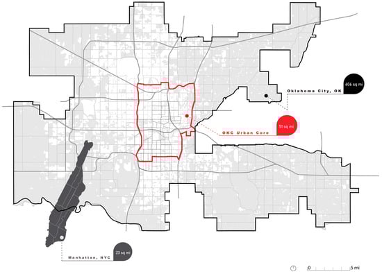 OKC (pop. 688361, as of 2021) is an ideal case study to consider UVL, as it encapsulates the main features of a growing middle U.S. city [22]. The city was founded in 1889, at the intersection between the Southern Kansas Railway and the Oklahoma River. The first additions that further defined its original rectangular gridiron were made of walkable blocks (approximately 122 × 91 m), with sixteen 15 × 43 m parcels. Low-rise residential neighborhoods, connected to downtown by a robust streetcar network, and middle housing types, like duplexes or fourplexes, had characterized the city’s growth until the 1940s [23]. For most of the twentieth century, OKC has continuously expanded its boundaries. Such land annexation policy was exasperated during the postwar years. In 1941, the city had a physical extent of 65 km2. In the following twenty years, OKC launched an aggressive land annexation program, by adding about 1554 km2 to its area, to prevent surrounding towns from expanding their territories and reducing the city’s economic growth opportunities [14]. Like other U.S. cities, the rapid postwar migration of middle-class white households from downtown OKC towards the suburbs led to population loss and land vacancy in the urban core. In 1940, downtown OKC hosted roughly 54,000 residents. According to recent studies, the same area currently hosts about 9000 residents [24].