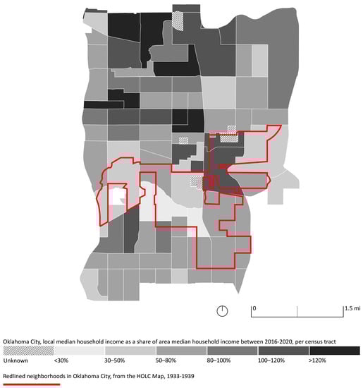 Map of median household income in OKC’s urban core census tracts as a share of area median household income between 2016–2020, with redlined neighborhoods in a 1930s Home Owners’ Loan Corporation (HOLC) map. Income data: United States Census Bureau and PolicyMap, (accessed on 20 August 2023). Original HOLC map data: Records of the Federal Home Loan Bank Board, Record Group 195, National Archives at College Park, College Park, MD, available online: https://www.docsteach.org/documents/document/redlining-map-of-oklahoma-city-oklahoma (accessed on 20 August 2023), image adapted by the authors.