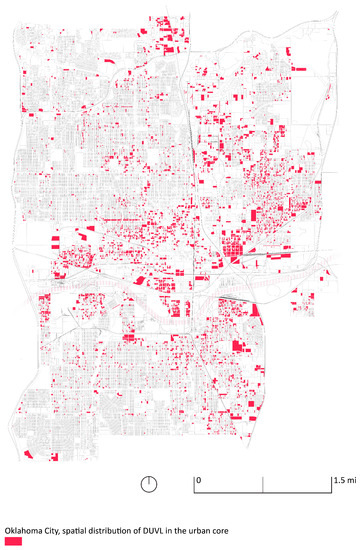 The number of DUVL parcels in OKC’s urban core is 7015, approximately 78.50% of UVL in the urban core, for a total area of 8 km2 (Figure 6). The percentage of DUVL in the total number of tax parcels is 10.64%, while the percentage of the DUVL area to the overall tax parcel area is 8.21%. The decision tree to detect UVL and DUVL is synthesized in Figure 7.