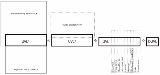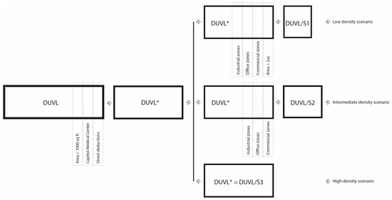 Flowchart to prepare DUVL according to each land-use scenario. DUVL* is the DUVL database without parcels in the Capitol-OU Medical Center area, parcels less than 93 m2 (1000 sq ft), and deducted area for new street and infrastructure creation.