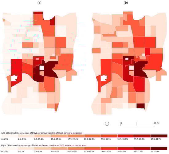 (a,b): Distribution pattern of DUVL parcels per census tract ((a): percentage of DUVL parcels; (b): percentage of DUVL area).