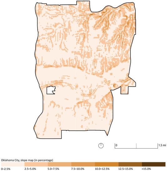 Finally, we developed a topographic analysis to check for a potential correlation between slope and vacancy in the urban core. For this task, we used the DEM image previously created to obtain slope percentages for DUVL (Figure 9). Regarding topographic features, DUVL is distributed within the elevation interval of 317 m (northeast OKC urban core) and 394.4 m (southwest OKC urban core), with 93.56% of DUVL with a slope less than 5% (Table S8).