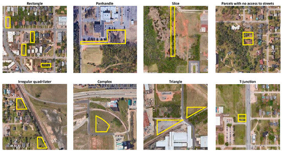 For the geometrical analysis, we classified vacant land according to shape and area. Starting with shape, we consulted existing urban vacancy studies [20] to identify the recurring geometries as follows (Figure 10). We focused our attention on the following shapes: